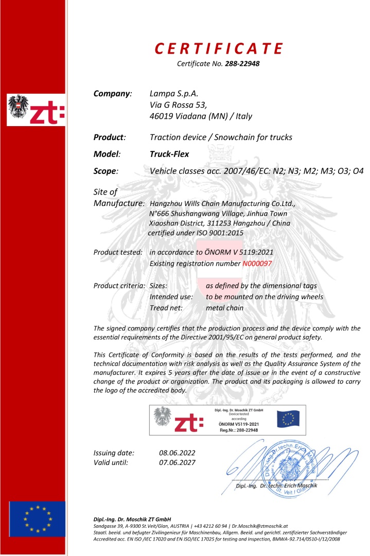 Αλυσίδα Φορτηγού Λεωφορείου Truck Flex με σύστημα για αυτόματο τέντωμα. Αλυσίδες φορτηγού και λεωφορείου με γρήγορο δέσιμο και μηχανισμό αυτόματου τεντώματος. Εφοδιασμένες με μεταλλικό ελατήριο τεντώματος. Σχήμα "διαμάντι" ειδικού χάλυβα στο πέλμα. Η αλυσίδα μπορεί να χρησιμοποιηθεί και απο τις δύο πλευρές για πολύχρονη αντοχή. Εγκεκριμένη TÜV AUSTRIA - ÖNORM V 5119 GEPRÜFT Δείτε τις διαστάσεις ελαστικών που καλύπτει: 10.0-20 12x80-20 11.0-22.5 275/80-22.5 305/70-22.5 315/70-22.5 No Michelin XDN2 Grip / No Michelin Multiway 3D XDE / No Bridgestone M729 300/70-24 8.3-28