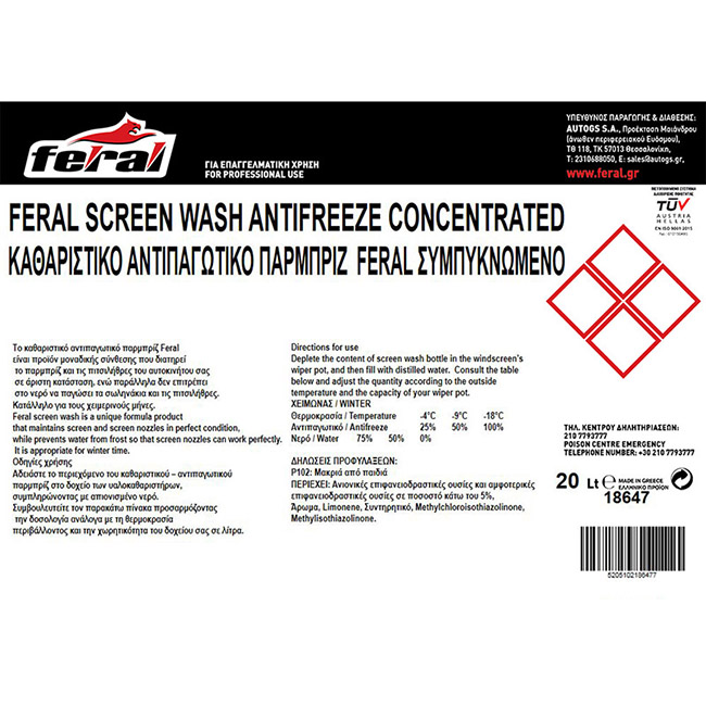Καθαριστικό Και Αντιπαγωτικό Παρμπρίζ Συμπυκνωμένο -18°C Feral 20lt 1 Τεμάχιο ×