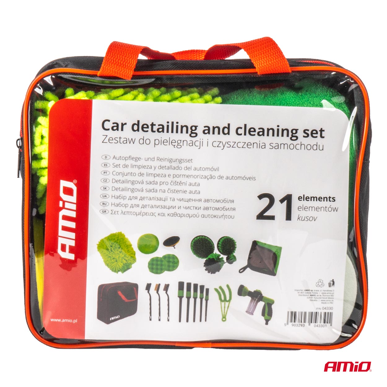 ΒΟΥΡΤΣΕΣ ΚΑΘΑΡΙΣΜΟΥ ΚΑΙ ΓΥΑΛΙΣΜΑΤΟΣ ΣΕΤ 21ΤΕΜ ΓΙΑ ΔΡΑΠΑΝΟ ΣΕ ΤΣΑΝΤΑ ΠΡΑΣΙΝΟ ΧΡΩΜΑ AMIO - 21 Τεμ. Ένα ολοκληρωμένο κιτ για το εσωτερικό και για το εξωτερικό του οχήματος, επιτρέποντας τον ενδελεχή καθαρισμό στοιχείων όπως εξάτμιση, προφυλακτήρες, παράθυρα, ελαστικά, ζάντες, εισαγωγές αέρα, καθίσματα και πολλά άλλα. Ανθεκτικά και αξιόπιστα εργαλεία κατασκευασμένα από μαλακά, ασφαλή για την επιφάνεια υλικά εξασφαλίζουν αποτελεσματικότητα και προστασία από ζημιές. Η συμπαγής κατασκευή εγγυάται μεγάλη διάρκεια ζωής του προϊόντος. Το σετ περιλαμβάνει: -Πιστόλι αφρού σωλήνα. -Μεγάλη στρογγυλή βούρτσα (8,5 cm) – για μεγάλες επιφάνειες. -Επίπεδη στρογγυλή βούρτσα (12 cm) – ακριβής καθαρισμός. -Μεγάλη βούρτσα (9 cm) – ιδανική για αμάξωμα και παράθυρα. -Μικρό πινέλο (4,5 cm). -Γάντι μικροϊνών. -2 σφουγγάρια (9,5 cm) – για πλύσιμο και γυάλισμα. -Βούρτσα εξαερισμού – ιδανική για δυσπρόσιτα στοιχεία εξαερισμού. -Πετσέτα μικροϊνών (30x30 cm) – για στέγνωμα και φινίρισμα. -Βούρτσες λεπτομερειών – ακριβή εργαλεία για τον καθαρισμό γωνιών και σχισμών. -Συρμάτινες βούρτσες σε διάφορες σκληρότητες - για επίμονη βρωμιά. -Μαλακό πινέλο για δύσκολα σημεία - ασφαλές για ευαίσθητες επιφάνειες. Συσκευασία 1 σετ.