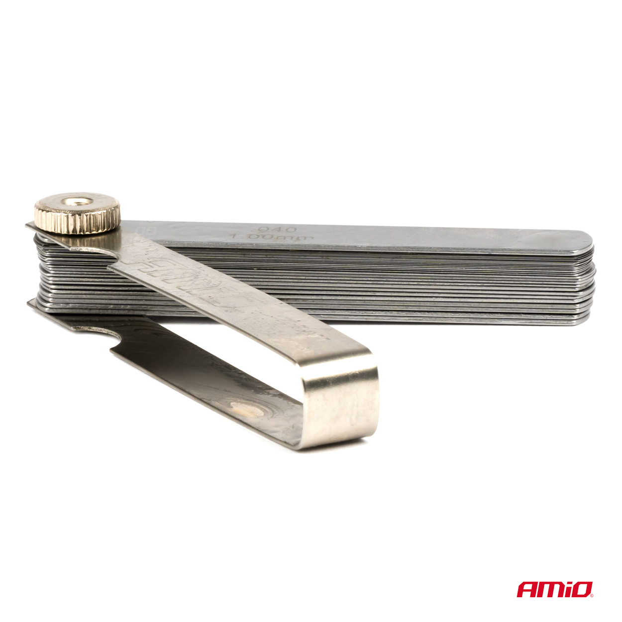 ΦΙΛΕΡ ΡΥΘΜΙΣΗΣ ΒΑΛΒΙΔΩΝ ΜΕ 32 ΛΑΜΕΣ 96mm/00,2-1mm ΑΜΙΟ - 1 ΤΕΜ. Φίλερ ρύθμισης βαλβίδων με 32 λάμες από την εταιρεία ΑΜΙΟ, πολωνικής προέλευσης. Ο αισθητήρας είναι κατασκευασμένος από σκληρυμένο χάλυβα ελατηρίου. -Υλικό: Σκληρυμένο ελατήριο χάλυβα -Ασημί χρώμα -Αριθμός φύλλων: 32 -Μήκος: 96 mm -Ύψος: 8 mm -Διαθέσιμα μεγέθη (mm): 0,02; 0,03; 0,04; 0,05; 0,06; 0,07; 0,08; 0,09; 0,10; 0,15; 0,18; 0,20; 0,23; 0,25; 0,28; 0,30; 0,33; 0,38; 0,40; 0,45; 0,50; 0,55; 0,60; 0,63; 0,65; 0,70; 0,75; 0,80; 0,85; 0,90; 1.00 Συσκευασία 1 τεμαχίου
