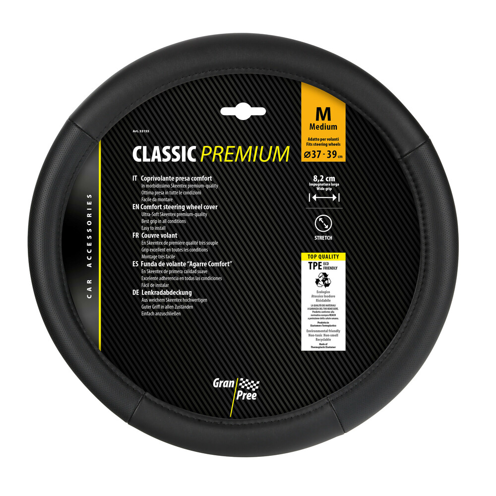 ΚΑΛΥΜΜΑ ΤΙΜΟΝΙΟΥ 37-39CM ΔΕΡΜΑ SKEENTEX ΜΑΥΡΟ CLASSIC PREMIUM GRAN PREE LAMPA - 1 ΤΕΜ. Κάλυμμα τιμονιού SKEENTEX από δέρμα σε μαύρο χρώμα της σειράς CLASSIC PREMIUM GRAN PREE, από την εταιρεία LAMPA, ιταλικής προέλευσης. Διάσταση: 37-39cm Συσκευασία 1 τεμαχίου