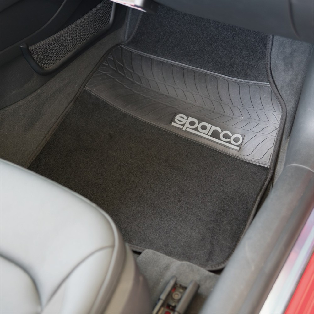• PVC πλαίσιο με το logo Sparco στα 2 εμπρόσθια πατάκια • Κατάλληλο για όλες τις εποχές • Μη ολισθιρή υποστήριξη • Εύκολο στο καθάρισμα • Το σετ περιλαμβάνει 2 εμπρόσθια και 2 οπίσθια πατάκια • Διεθνής σχεδιασμός για να να εφαρμόζει στα περισσότερα αυτοκίνητα • Διαθέσιμα χρώματα: Γρκι - Μαύρο • Διαστάσεις: Εμπρόσθια: 70 x 48 cm Οπίσθια: 39 x 44 cm Βάρος: 5,15 kg