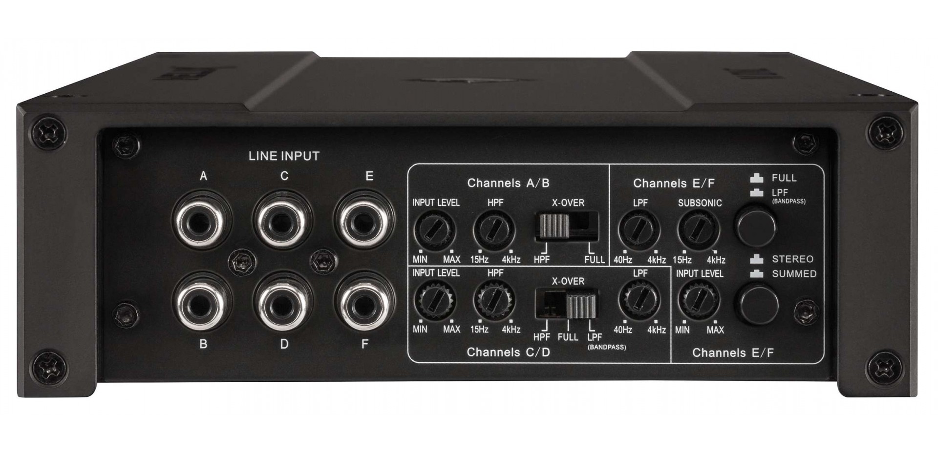 - Ενσωματωμένο ενεργό crossover (Subsonic, low-pass, band-pass, high-pass)