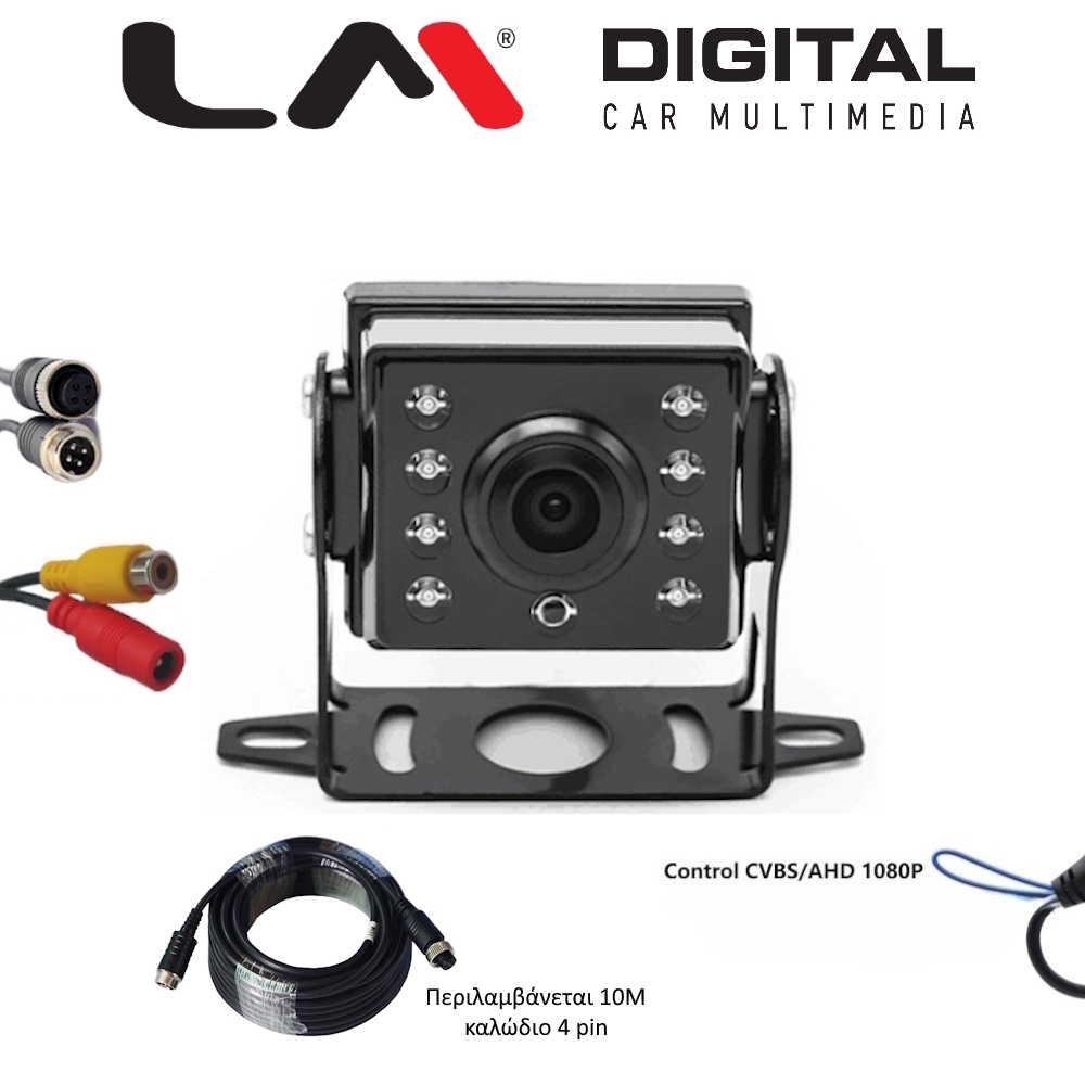 | Επιπλέον χαρακτηριστικά multimedia | Κάμερα Συμβατότητα: Universal Ανάλυση κάμερας: AHD 1080p 30fps/CVBS επιλογή από κόψιμο καλωδίου Διαστάσεις: Μήκος: 46mm Θέση: Πίσω Λειτουργία Mirror: Όχι Γραμμές: Όχι Οπτική Γωνία: 150ο Καλώδιο Σύνδεσης: 4 pin σε RCA Περιέχεται 10 μέτρα καλώδιο 4pin και αντάπτορας 4 pin σε RCA Αδιαβροχοποίηση: IP67 Monitor: Κατανάλωση 5W |