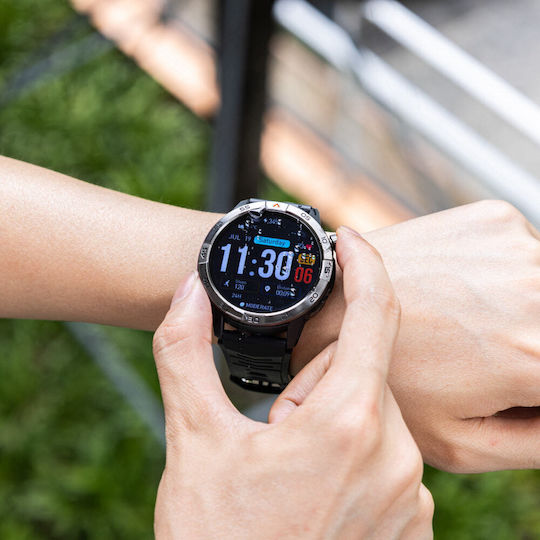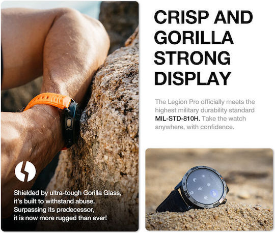 Το AGM Legion Pro είναι ένα ανθεκτικό outdoor smartwatch που διαθέτει οθόνη AMOLED 1.43 με ρυθμό ανανέωσης έως 60Hz και προστασία Gorilla Glass 3. Παρέχει προδιαγραφές IP68/MIL-STD-810H και αντοχή 5ATM για υποβρύχια χρήση έως 50m. Υποστηρίζει GPS με ανεξάρτητο chip, offline χάρτες μέσω εφαρμογής και Bluetooth 5.3 για τηλεφωνικές κλήσεις. Διαθέτει περισσότερες από 100 αθλητικές λειτουργίες και πλήρες πακέτο υγείας, που περιλαμβάνει καρδιογράφημα, μέτρηση SpO2, παρακολούθηση ύπνου, βήματα και θερμίδες.