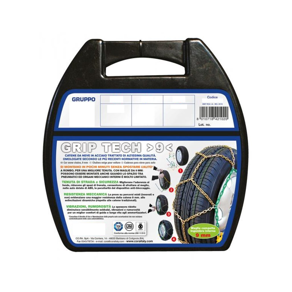 Αλυσίδες χιονιού με κρίκους 9 mm, κατασκευασμένες από επεξεργασμένο χάλυβα υψηλής ποιότητας. Χάρη στο μικρό τους μέγεθος, μπορούν να τοποθετηθούν ακόμη και όταν ο χώρος μεταξύ των ελαστικών και των εσωτερικών μηχανικών μερών είναι πολύ περιορισμένος. Το μοτίβο με κρίκους (ρομβους), βελτιώνει την πρόσφυση στο κάτω μέρος, επιτρέποντας μικρότερες αποστάσεις φρεναρίσματος και διασφαλίζοντας καλύτερη εκμετάλλευση της διάταξης αντιμπλοκαρίσματος σε αυτοκίνητα εξοπλισμένα με ABS. Το μειωμένο πάχος μειώνει σημαντικά τους κραδασμούς και τον θόρυβο, αυξάνοντας την οδηγική άνεση και τη διάρκεια ζωής των αμορτισέρ. Γρήγορη και εύκολη συναρμολόγηση σε λιγότερο από 3 λεπτά χωρίς να μετακινήσετε ή να σηκώσετε το αυτοκίνητο. Συμβατό με UNI 11313, CUNA NC 178-01, ONORM V5117. Κατάλληλο για τα ακόλουθα μεγέθη ελαστικών: 13" (165/80/13, 175/70/13, 175/75/13, 185/65/13, 205/50/13, 205/55/13), 14" (155/80/14, 165/70/14, 175/65/14, 185/60/14, 195/55/14, 205/45/14), 15" (155/70/15, 165/60/15, 165/65/15, 175/50/15, 175/55/15, 185/50/15, 195/45/15), 16" (175/50/16, 195/40/16).