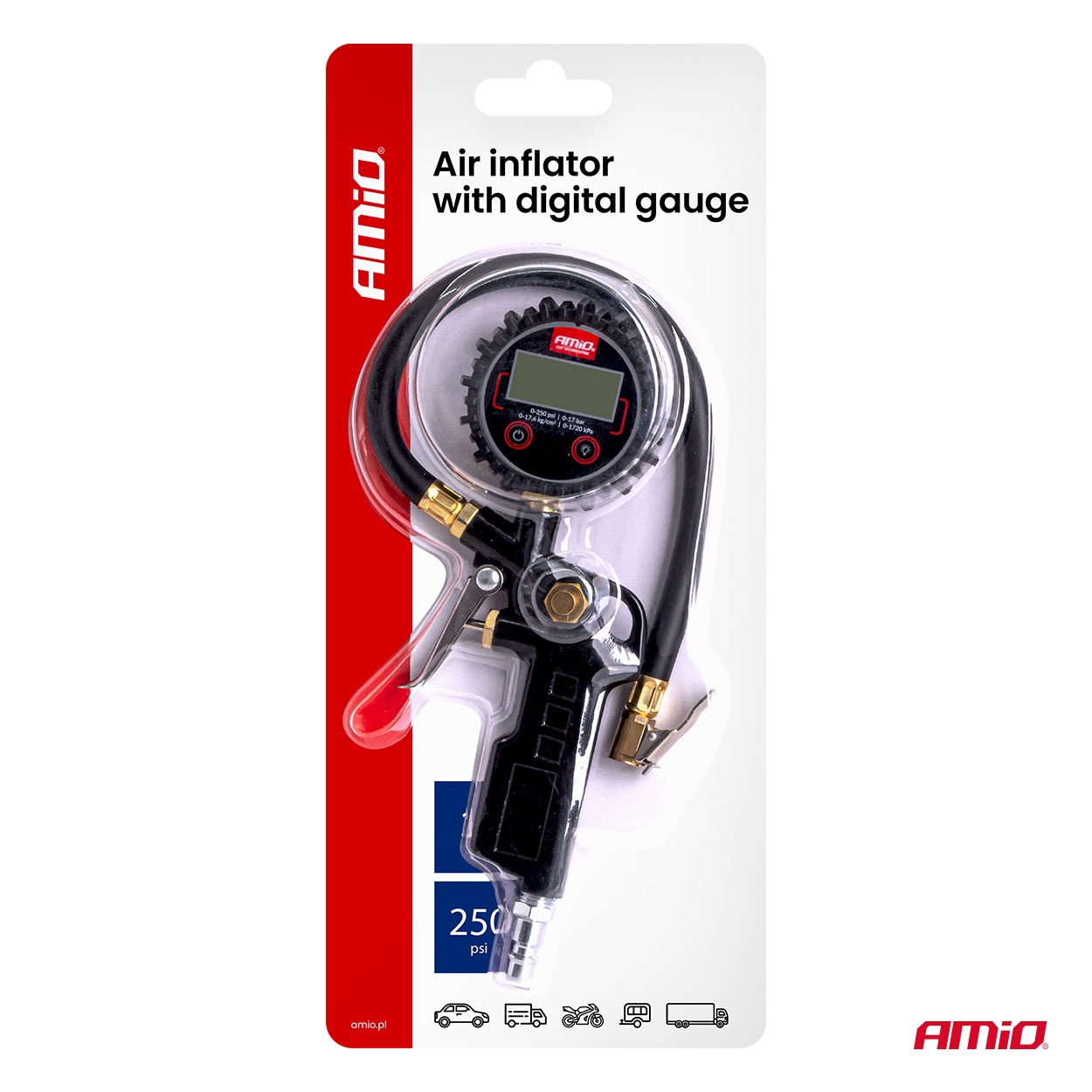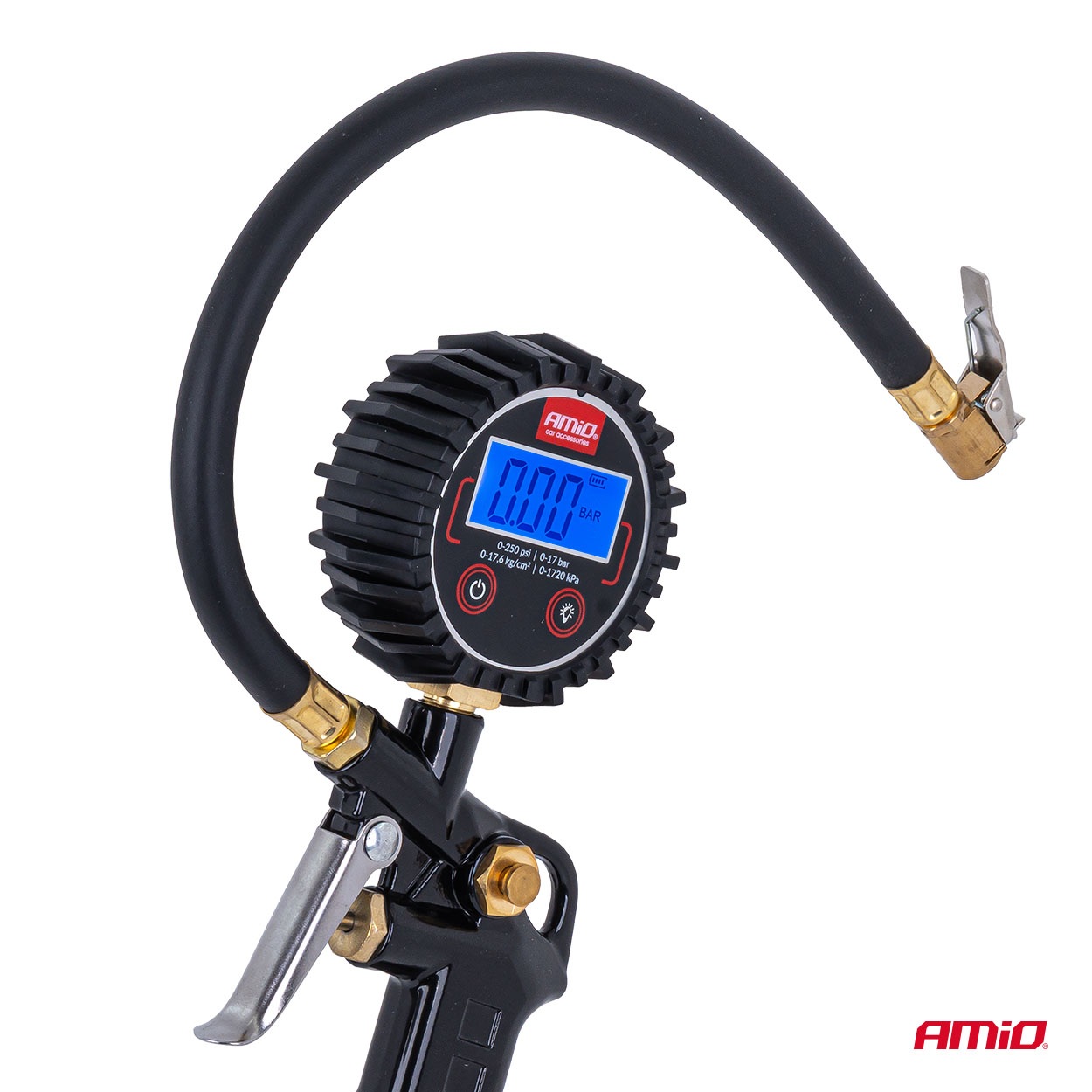 Amio - Επαγγελματικό αερόμετρο φουσκώματος με ψηφιακό μανόμετρο 17 bar – Οθόνη LCD βαλβίδα εκτόνωσης σωλήνας 30cm
