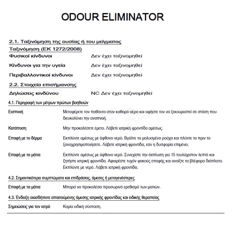 Οι επίμονες οσμές απαιτούν μια πιο δραστική λύση. Η προηγμένη φόρμουλα του Odour Eliminator δεν φρεσκάρει ή αρωματίζει τον αέρα αλλά εξουδετερώνει ολοκληρωτικά τις άσχημες οσμές από τον αέρα αφήνοντας μια φρεσκάδα στο εσωτερικό του αυτοκινήτου.