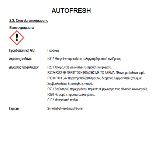 Το AUTO FRESH της AUTOGLYM είναι ένα νέου τύπου συμπυκνωμένο άρωμα εσωτερικών χώρων που εξουδετερώνει αμέσως όλες τις δυσάρεστες οσμές από τσιγάρο, υγρασία κ.λ.π.Ψεκάζεται απευθείας σε όλες τις απορροφητικές επιφάνειες όπως ταπετσαρίες αυτοκινήτων, χαλιά, μοκέτες, πατάκια, κουρτίνες και χάρη στην μοναδική του σύνθεση δεν αφήνει λεκέδες. Κατάλληλο για χρήση σε αυτοκίνητο, τροχόσπιτο, σκάφος, γραφείο. Κατάλληλο και για οικιακή χρήση.Δεν περιέχει προωθητικά αέρια.