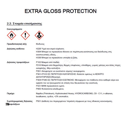 Το Extra Gloss Protection προστατεύει για πολύ μεγαλύτερο διάστημα το γυάλισμα και το φινίρισμα που έχετε κάνει στο όχημα σας. Το Extra Gloss Protection είναι ένα μείγμα από σκληρές ρητίνες, σκληρά κεριά, έλαια και προστατευτικές ουσίες που αντέχει για μεγάλο χρονικό διάστημα. Δίνει μια τρομερή στιλπνότητα & γυαλάδα, και παρέχει υψηλή προστασία ενάντια στην οξείδωση, ατμοσφαιρική ρύπανση και σε χημικά στοιχεία.