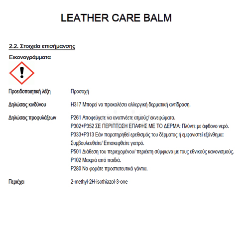 TIPS : Αρχικά χρησιμοποιείστε το Leather Cleaner για να εξασφαλίσετε ότι το Leather Care Balm θα απορροφηθεί πλήρως σε μια καθαρή επιφάνεια.