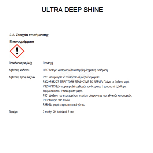 Η Ultra Deep Shine είναι μια αλοιφή «all in one» που γυαλίζει και προστατεύει. Για αυτό το λόγο συνιστάται να μην χρησιμοποιηθούν τα κεριά μας Extra Gloss Protection ή High Definition Wax μετά την Ultra Deep Shine
