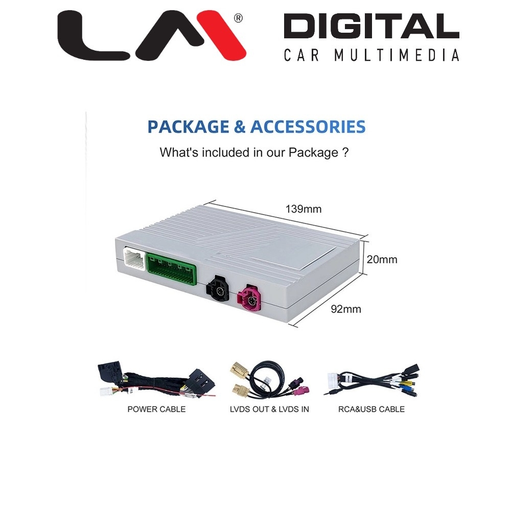 | Περιγραφή | Interface για ασύρματο Apple Car Play, ασύρματο Android Auto, Screen Mirrorink, Bluetooth, USB Player & Κάμερα για σύστημα NTG 6.0 MBUX με Double LVDS συμβατό με οθόνες10,25 ιντσών για αυτοκίνητα Mercedes 2019 > Διατηρεί όλες τις εργοστασιακές ενδείξεις του ηχοσυστήματος στην οθόνη του αυτοκινήτου με πλήρη ενσωμάτωση των εργοστασιακών χειριστηρίων του αυτοκινήτου. |
