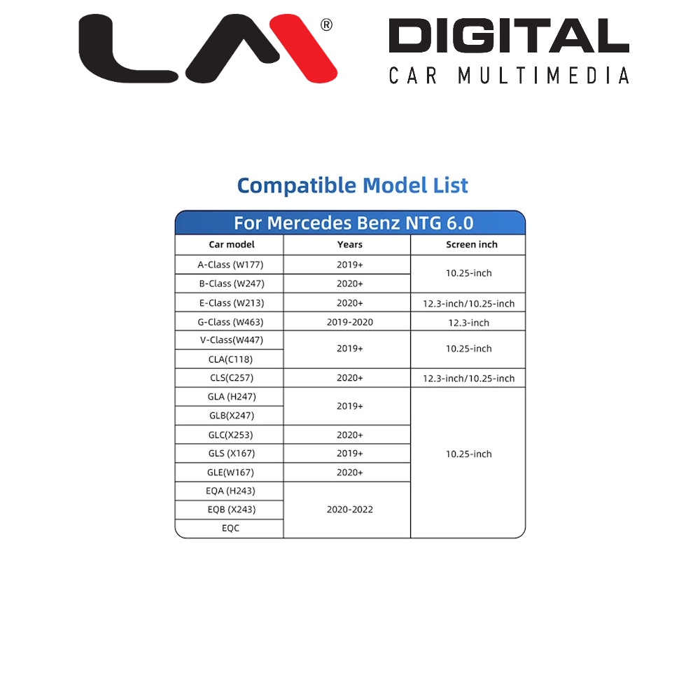 | Συμβατή για μοντέλα | Mercedes A Class, W177, 2019> B Class, W247, 2020> GLB, 2020> GLC, W253, 2020> GLE, 2020> GLS, 2020> G Wagon, 2019-2020 V Class, 2021> CLA (C118) 2019> 10.25inc CLS (C257) 2020> GLA (H247) 2019> GLB (X247) 2019> GLC (X253) 2020> GLS (X167) 2019> GLE (W167) 2020> EQA (H243) 2020>2022 EQB (X243) 2020>2022 EQC 2020>2022 |