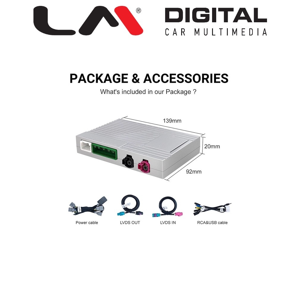 | Επιπλέον χαρακτηριστικά multimedia | Πλήρη λειτουργικότητα Apple Car Play για iPhone 5 ή νεότερη έκδοση Χρησιμοποιήστε τις αγαπημένες σας εφαρμογές τηλεφώνου για πλοήγηση GPS (Google Maps, Waze, Apple Maps κ.λπ.) και παραμείνετε ενήμεροι με ζωντανές πληροφορίες κυκλοφορίας Επιτρέπει την ανοικτή κλήση και την ανταλλαγή μηνυμάτων μέσω του Siri Επιτρέπει τον φωνητικό έλεγχο μέσω του Siri Επιτρέπει την είσοδο μπροστινής / οπίσθιας κάμερας Αναπαραγωγή μουσικής από τις αγαπημένες σας εφαρμογές τηλεφώνου. Ο ήχος βγαίνει είτε μέσω του Aux Μπορεί να συνδεθεί ασύρματα μέσω θύρας Bluetooth ή θύρας USB (περιλαμβάνεται στο κιτ) για να διατηρεί το τηλέφωνό σας φορτισμένο ταυτόχρονα Η θύρα USB που περιλαμβάνεται μπορεί επίσης να δεχτεί μονάδα αποθήκευσης USB για αναπαραγωγή αρχείων μουσικής και βίντεο Συνεργάζεται απόλυτα με τα εργοστασιακά χειριστήριά του αυτοκινήτου. Όλα τα καλώδια είναι πλήρως Plug and Play |