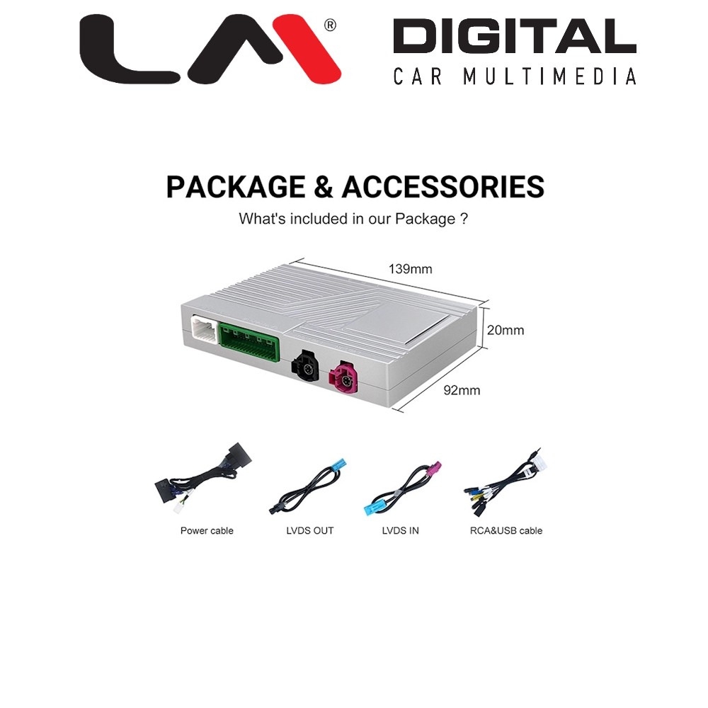 | Επιπλέον χαρακτηριστικά multimedia | Πλήρη λειτουργικότητα Apple Car Play για iPhone 5 ή νεότερη έκδοση Χρησιμοποιήστε τις αγαπημένες σας εφαρμογές τηλεφώνου για πλοήγηση GPS (Google Maps, Waze, Apple Maps κ.λπ.) και παραμείνετε ενήμεροι με ζωντανές πληροφορίες κυκλοφορίας Επιτρέπει την ανοικτή κλήση και την ανταλλαγή μηνυμάτων μέσω του Siri Επιτρέπει τον φωνητικό έλεγχο μέσω του Siri Επιτρέπει την είσοδο μπροστινής / οπίσθιας κάμερας Αναπαραγωγή μουσικής από τις αγαπημένες σας εφαρμογές τηλεφώνου. Ο ήχος βγαίνει είτε μέσω του Aux Μπορεί να συνδεθεί ασύρματα μέσω θύρας Bluetooth ή θύρας USB (περιλαμβάνεται στο κιτ) για να διατηρεί το τηλέφωνό σας φορτισμένο ταυτόχρονα Η θύρα USB που περιλαμβάνεται μπορεί επίσης να δεχτεί μονάδα αποθήκευσης USB για αναπαραγωγή αρχείων μουσικής και βίντεο Συνεργάζεται απόλυτα με τα εργοστασιακά χειριστήριά του αυτοκινήτου. Όλα τα καλώδια είναι πλήρως Plug and Play |