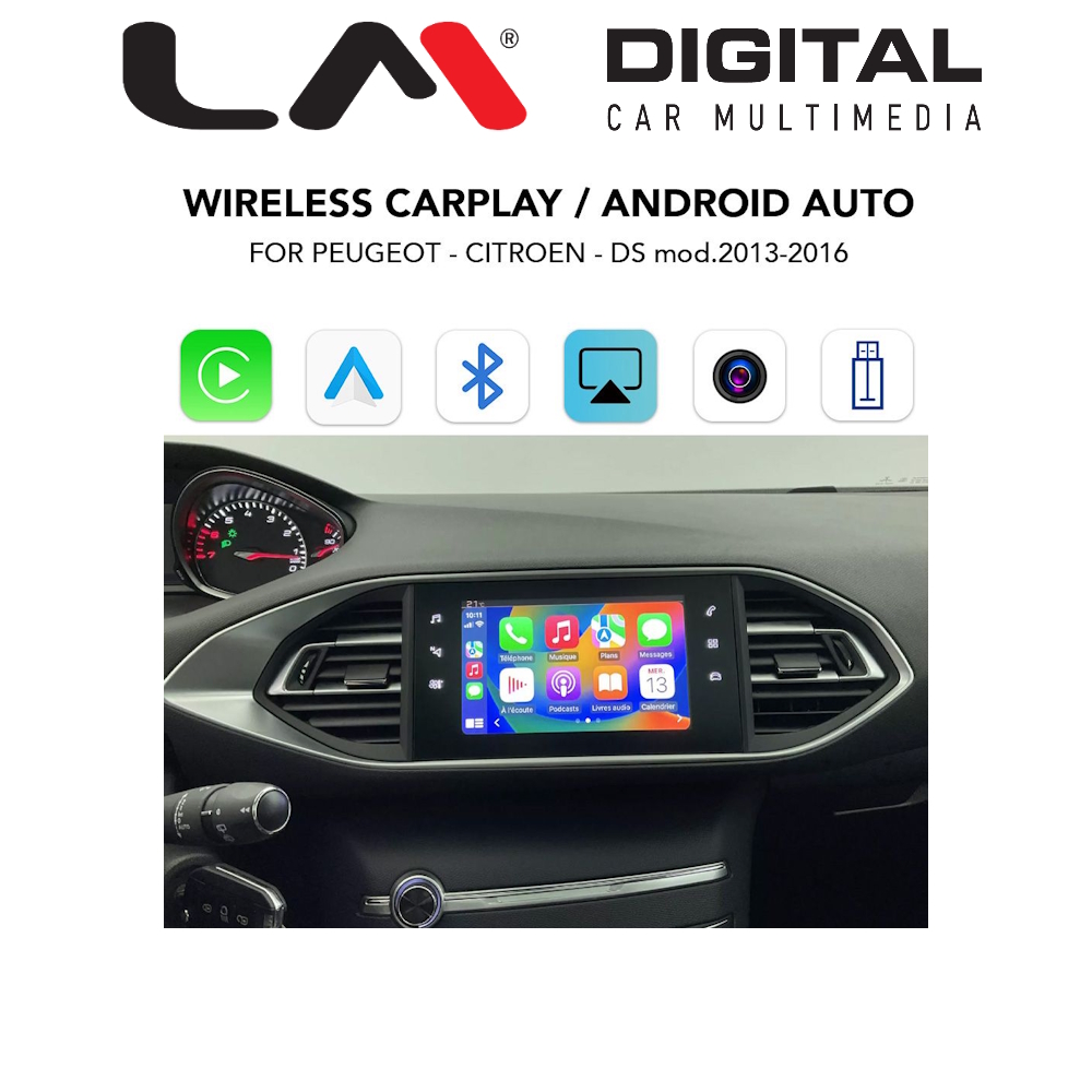 | Περιγραφή | Interface για ασύρματο Apple Car Play, Android Auto, κατάλληλο για Peugeot και Citroen, διατηρώντας όλες τις εργοστασιακές ενδείξεις του ηχοσυστήματος στην οθόνη του αυτοκινήτου με πλήρη ενσωμάτωση των εργοστασιακών χειριστήριων του αυτοκινήτου. |