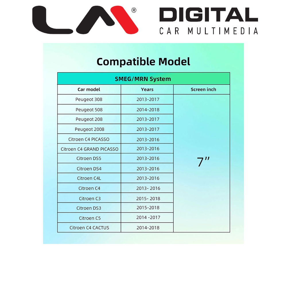 | Συμβατή για μοντέλα | system MRN SMEG 7 Screen εργοστασιακό μηχάνημα σε Peugeot 308/208/2008 2014 > 2018 508 2013 > 2016 Citroen C4 GRAND PICASSO 2013 > 2016 C4 PICASSO 2013 > 2016 DS5/DS4/C4 2015 >2018 C3/DS3 2014 > 2017 C5 2014 > 2018 C4 |