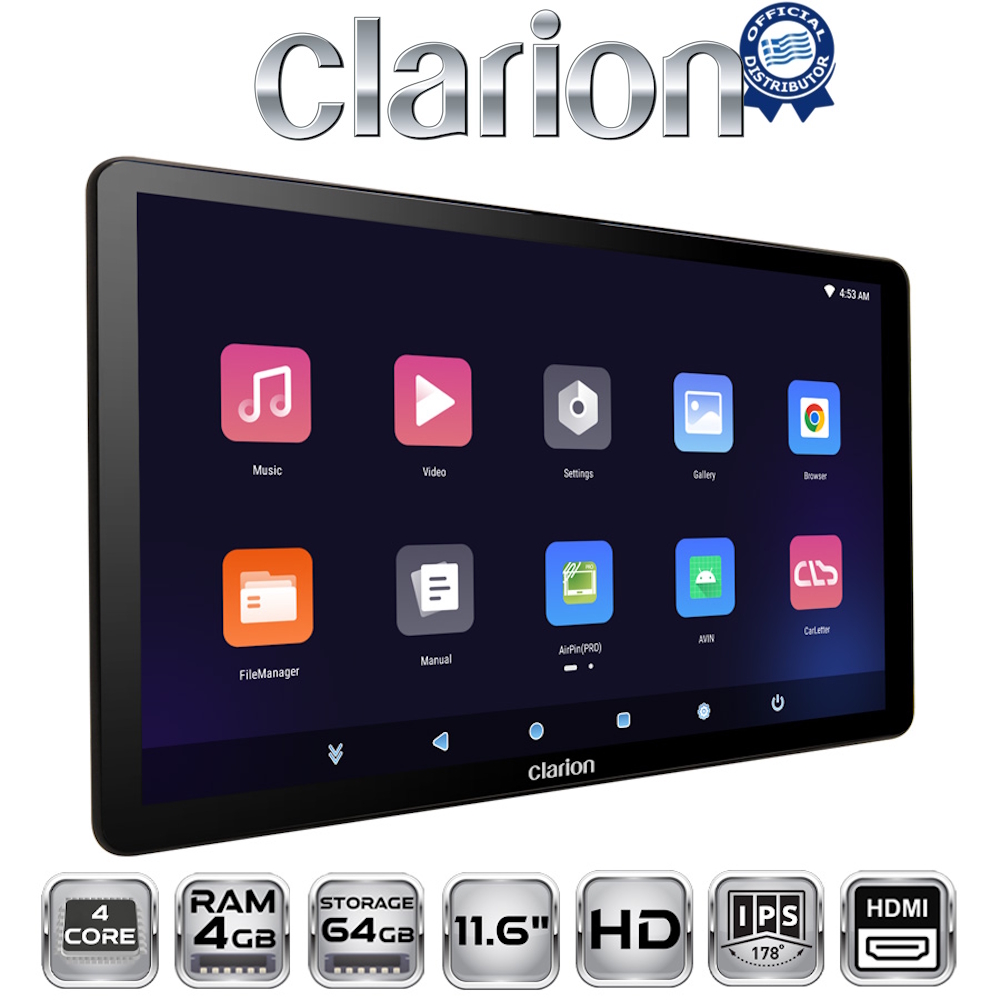 CLARION 11.6in HEADREST MONITOR 4core 2+32G - HDMI input/ output FM Modulator / BT / WiFi / USB / SD Card Slot