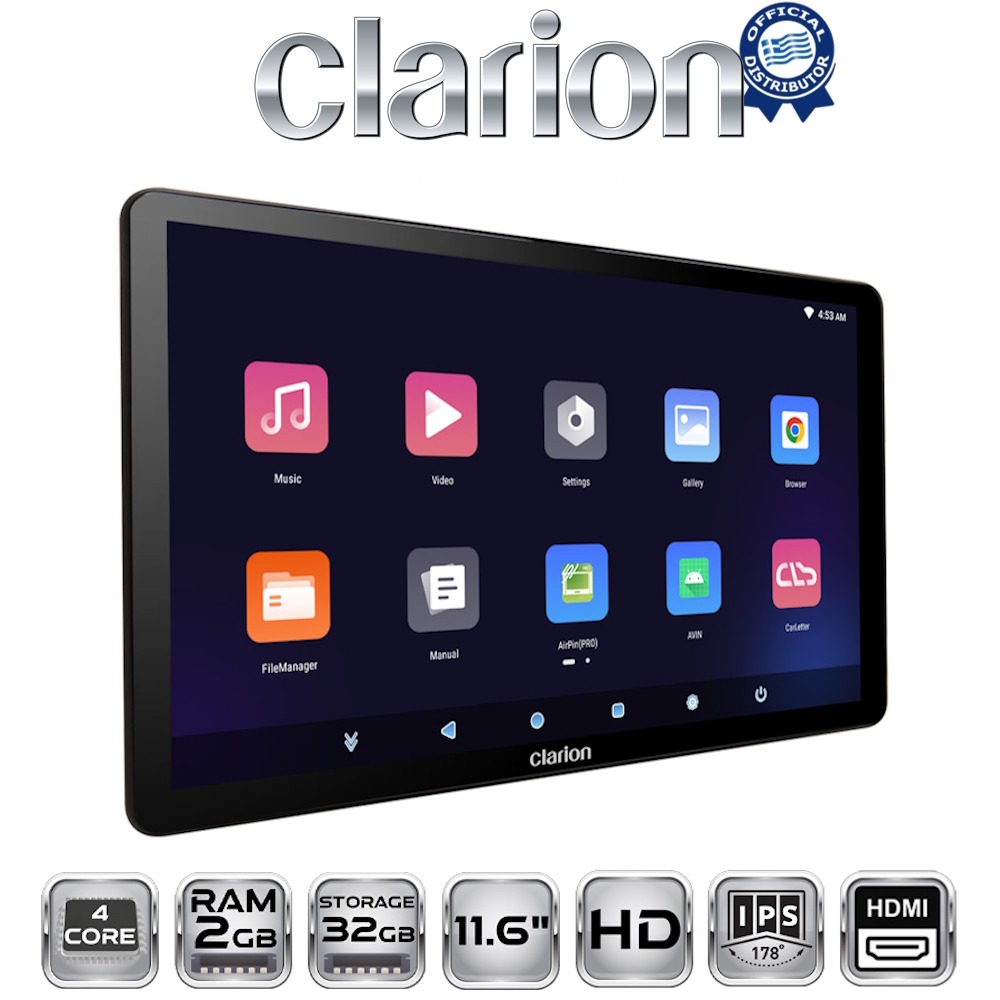 CLARION 11.6in HEADREST MONITOR 4core 2+32G - HDMI input/ output FM Modulator / BT / WiFi / USB / SD Card Slot