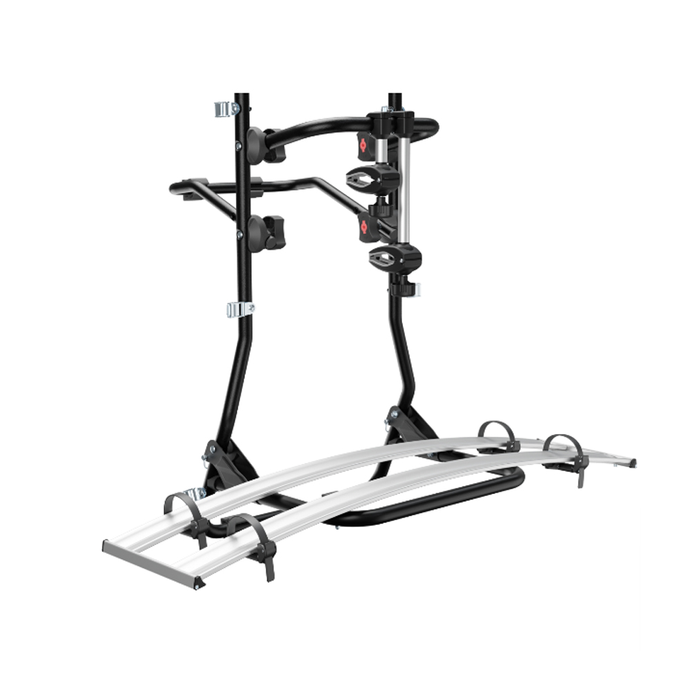 Στο πάνω μέρος έχει 2 ρυθμιζόμενα μπράτσα με ροδέλες για τέλεια προσαρμογή επάνω στο σκελετό των ποδηλάτων, συγκρατώντας τα σταθερά κατά τη μεταφορά ενώ παρέχεται και η δυνατότητα χρήσης πρόσθετης κλειδαριάς (δεν περιλαμβάνεται – πωλείται ξεχωριστά) στο κάθε ένα από αυτά. Στο κάτω μέρος οι ράγες (βέργες) συγκράτησης των ελαστικών διαθέτουν στο κάθε άκρο τους από 2 ιμάντες δέσης (λουριά) για να συγκρατούν με απόλυτη ασφάλεια και σταθερότητα τους τροχούς των ποδηλάτων.