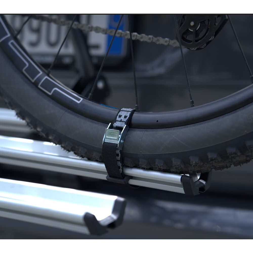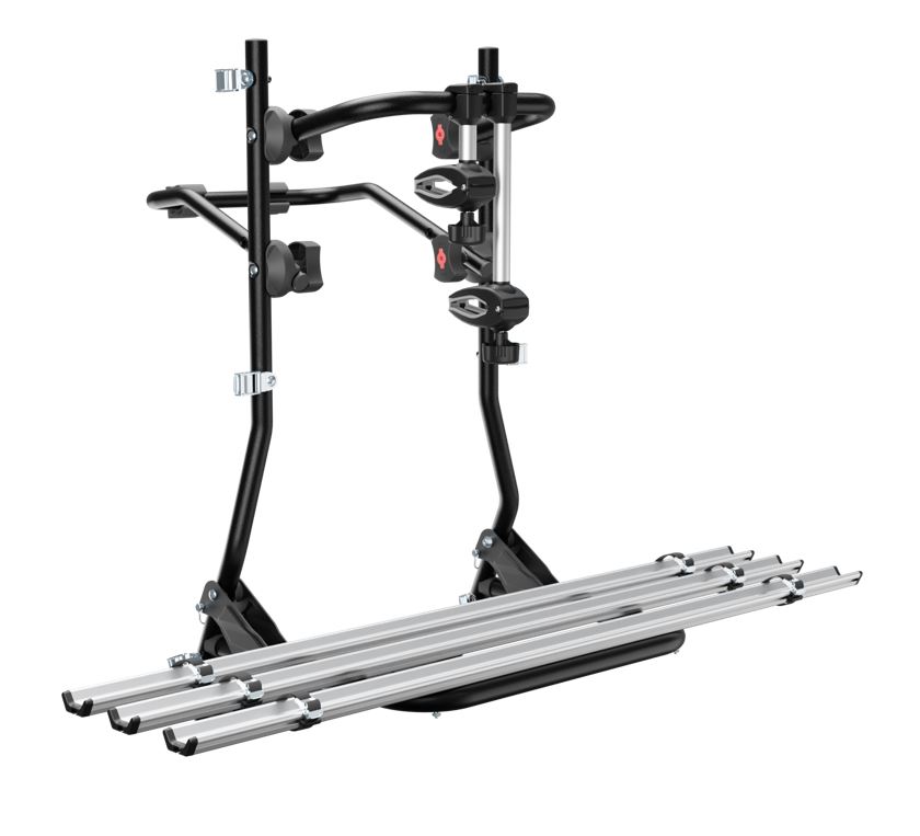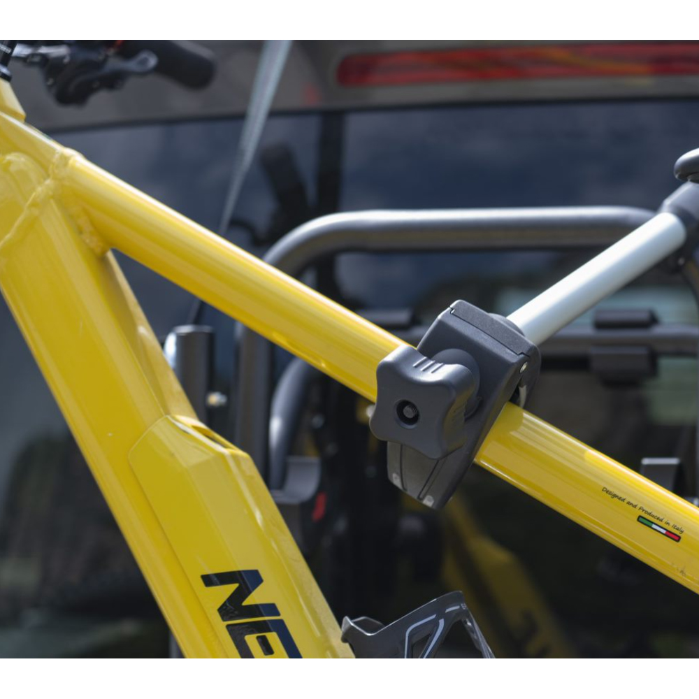 Στο πάνω μέρος έχει 2 ρυθμιζόμενα μπράτσα με ροδέλες για τέλεια προσαρμογή επάνω στο σκελετό των ποδηλάτων, συγκρατώντας τα σταθερά κατά τη μεταφορά ενώ παρέχεται και η δυνατότητα χρήσης πρόσθετης κλειδαριάς (δεν περιλαμβάνεται – πωλείται ξεχωριστά) στο κάθε ένα από αυτά. Στο κάτω μέρος οι ράγες (βέργες) συγκράτησης των ελαστικών διαθέτουν στο κάθε άκρο τους από 2 ιμάντες δέσης (λουριά) για να συγκρατούν με απόλυτη ασφάλεια και σταθερότητα τους τροχούς των ποδηλάτων.