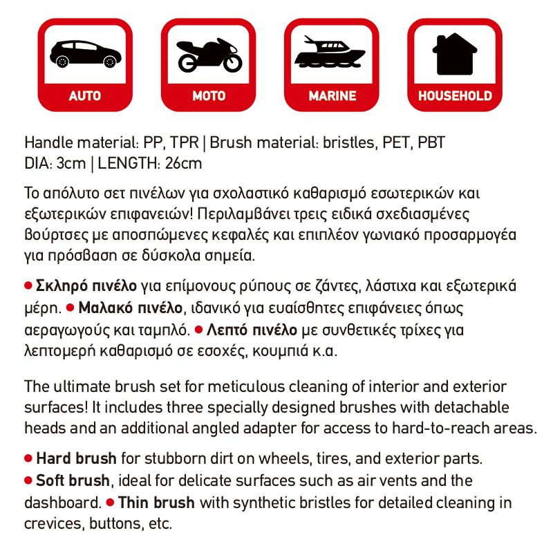 - Σκληρό πινέλο για επίμονους ρύπους σε ζάντες, λάστιχα και εξωτερικά μέρη.
