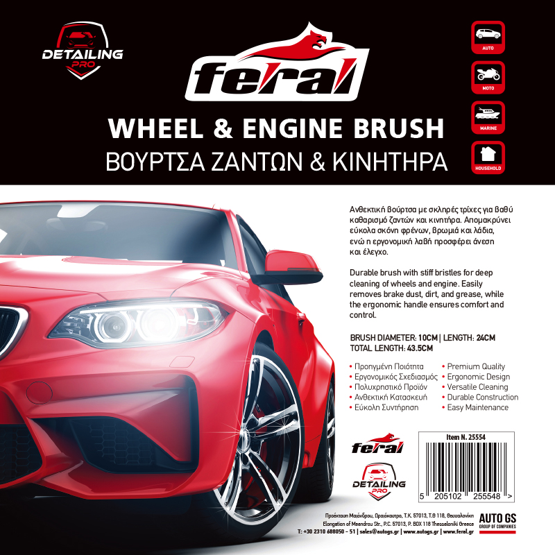 Αν αναζητάτε ένα ισχυρό αλλά ασφαλές εργαλείο για τον καθαρισμό του αυτοκινήτου σας, η WHEEL & ENGINE BRUSH της Feral συνδυάζει απόδοση, εργονομία και αντοχή για επαγγελματικό αποτέλεσμα κάθε φορά.