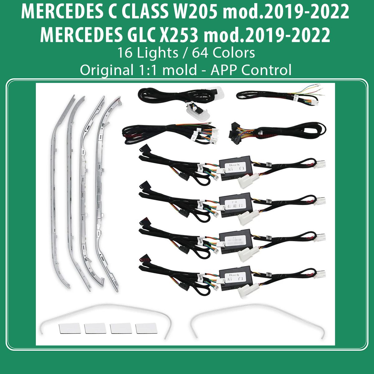 - 16 light sources (6 lights armrest box, 4 door contour lights, 4 door handle lights, and 2 front footwell lights).