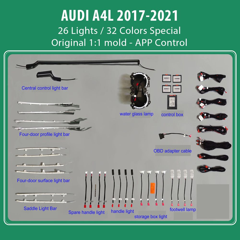 - 26 lights (4 door handle light, 4 door surface background light, 4 door outline light, 4 door storage box light, 4 footwell light, 2 saddle, 2 water cup, 2 left and right center console)