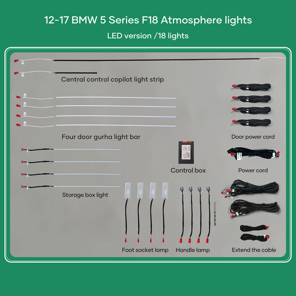 - 18 lights (4-door handle light, 4-door outline light bar, 4-door storage box light bar, 4 footwell lights, 1 central control co-driver through, 1 main driver)