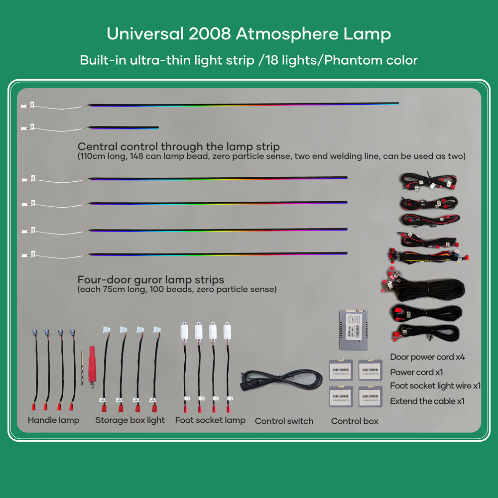 - Standard 18pcs lights (4pcs door handle lights, 4pcs door outline lights, 4pcs door storage box lights, 4pcs footwell lights, 2pcs central control lights)