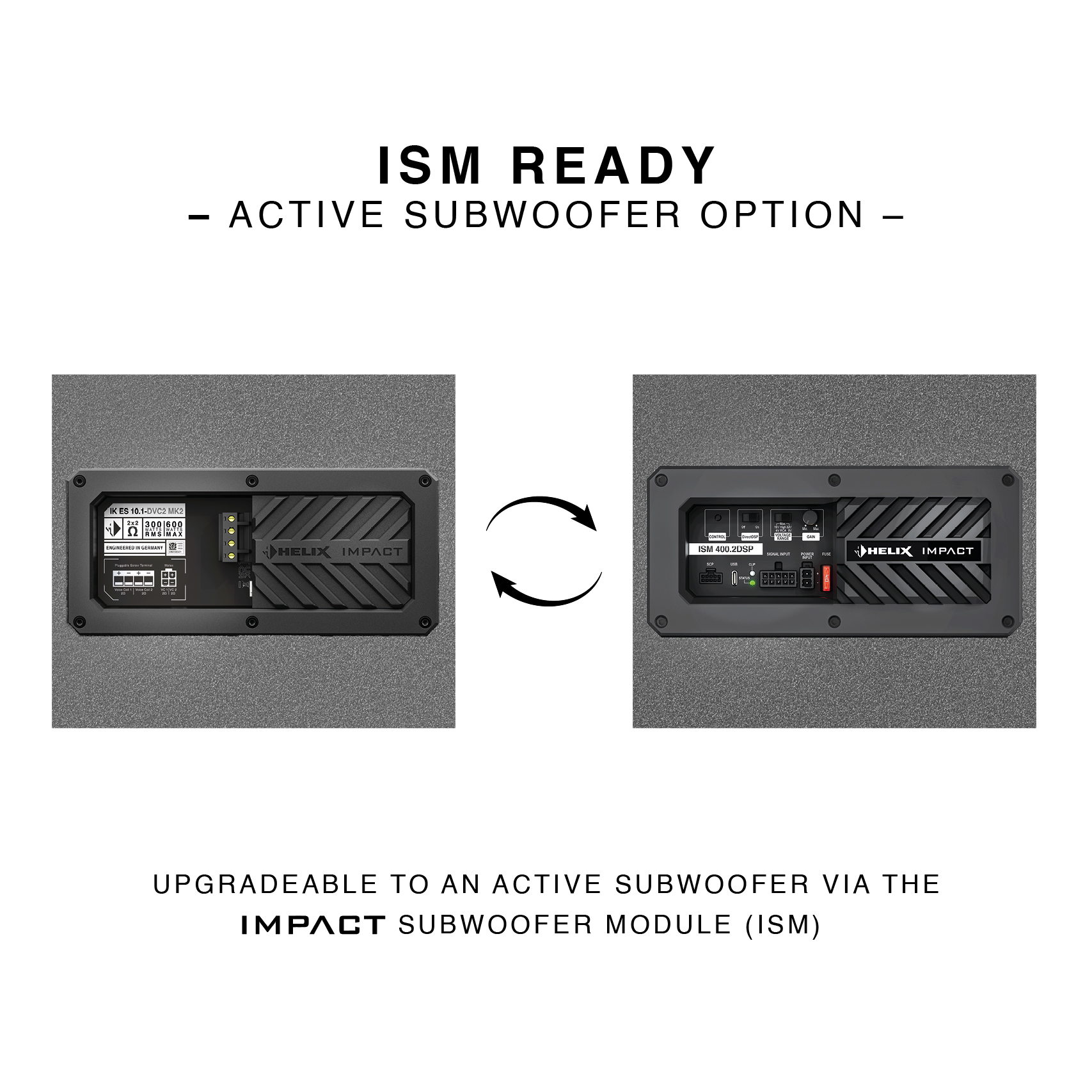 In the MK2 version, the IK ES10.1-DVC2 is now ISM-ready: By replacing the passive terminal with the optional IMPACT Subwoofer Module (e.g. ISM 400.2DSP), the enclosure subwoofer can be upgraded to an active subwoofer in no time. As a direct-fit solution, the ISM 400.2DSP is a powerful amplified subwoofer module with integrated signal processor – developed for high-quality subwoofer upgrades in modern vehicles with factory-installed sound systems. This results in a compact all-in-one solution combining amplification and DSP signal processing for powerful yet controlled bass – without having to rebuild the existing system.