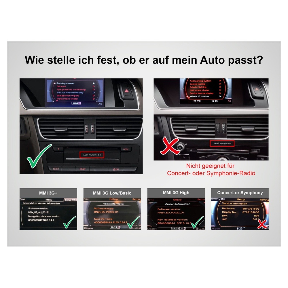 | 2008-2015 | Audi | Q5 | OEM radio: AUDI MMI 3G+/3G High system, 7 monitor, 4-pin LVDS connector. AUDI MMI 3G Basic/Low, 6.5 monitor, 4-pin LVDS connector. |