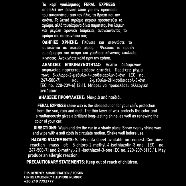 Το κερί γυαλίσματος FERAL express αποτελεί την ιδανική λύση για την προστασία του αυτοκινήτου από τον ήλιο, τη βροχή και τη σκόνη. Το λεπτό στρώμα κεριού προστατεύει το χρώμα, ενώ ταυτόχρονα δίνει παρατεταμένη λάμψη για μεγάλη χρονική διάρκεια, ανανεώνοντας το χρώμα του αυτοκινήτου σας.