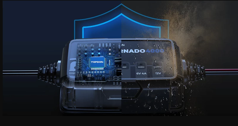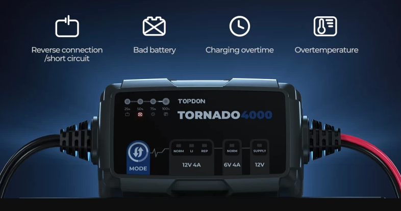 Η κατοχυρωμένη με δίπλωμα ευρεσιτεχνίας έξυπνη φόρτιση 9 βημάτων της TOPDON προσφέρει στην μπαταρία μολύβδου σας μια βελτιστοποιημένη, διατηρούμενη και ολοκληρωμένη διαδικασία φόρτισης. Όταν συνδεθεί, το Tornado4000 όχι μόνο θα φορτίσει την μπαταρία, αλλά θα λειτουργήσει ως συντήρηση μπαταρίας για να επισκευάσει πραγματικά την μπαταρία του αυτοκινήτου σας. Επιπλέον, το Tornado4000 ειδικεύεται στην παροχή έξυπνης λειτουργίας φόρτισης 5 βημάτων για μπαταρίες λιθίου.