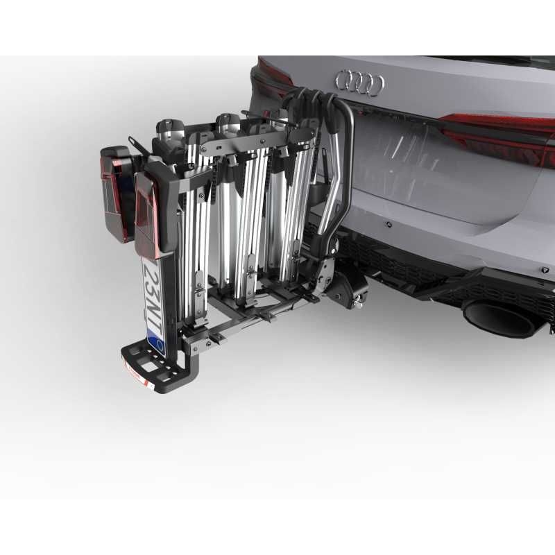 Towbar bike rack with central structure in high-resistance steel, with cataphoresis treatment and powder coating with embossed finish.