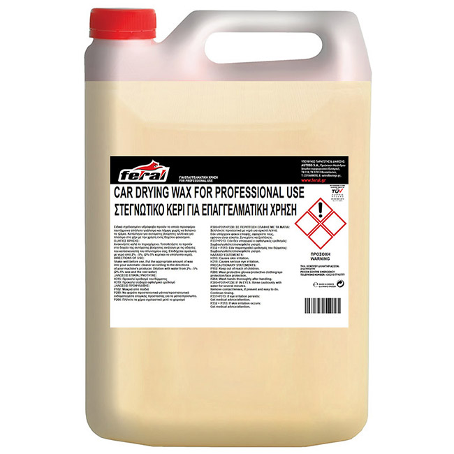 To στεγνωτικό κερί Feral είναι ειδικά σχεδιασμένο, υδρόφοβο προϊόν, το οποίο προσφέρει ταυτόχρονα απόλυτο γυάλισμα και λάμψη. Κατάλληλο για αυτόματες βούρτσες, αλλά και για πλύσιμο στο χέρι με την χρήση ενός δοχείο ψεκασμού.