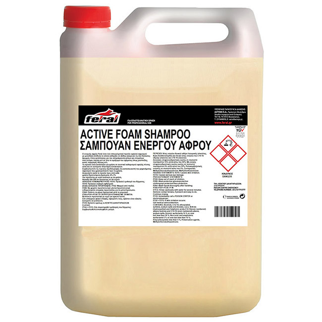 Το Σαμπουάν Αυτοκινήτου Ενεργού Αφρού Feral είναι ένα επαγγελματικό προϊόν υψηλού αφρισμού, με μοναδική σύνθεση το οποίο καθαρίζει σε βάθος, ακόμη και τις πιο δύσκολες βρωμιές. Είναι κατάλληλος για την απομάκρυνση ρίπων και στιγμάτων από έντομα, λάσπη κτλ σε όλο το αμάξωμα του οχήματος, όπως μασπιέδες, καπό, παρμπρίζ, θόλους κτλ. Το προϊόν είναι κατάλληλο για χρήση σε πιεστικά καθαρισμού υψηλής πίεσης, αλλά και σε αυτόματα πλυντήρια αυτοκινήτων. Διατίθεται και με άρωμα BUBBLE.