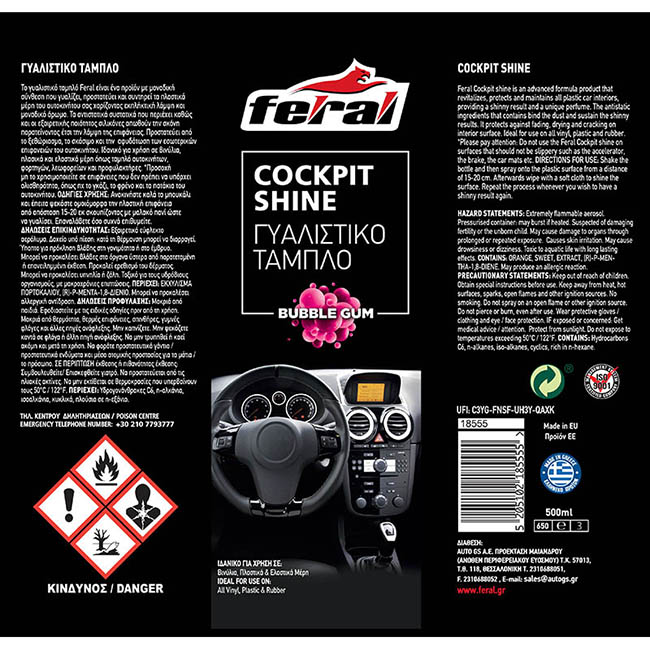 Το γυαλιστικό ταμπλό Feral, είναι ένα προϊόν με μοναδική σύνθεση που γυαλίζει, προστατεύει και συντηρεί τα πλαστικά μέρη του αυτοκινήτου σας χαρίζοντας εκπληκτική λάμψη, και μοναδικό άρωμα. Τα αντιστατικά συστατικά που περιέχει καθώς και η εξαιρετικής ποιότητας σιλικόνες απωθούν την σκόνη παρατείνοντας έτσι τη λάμψη της επιφάνειας.