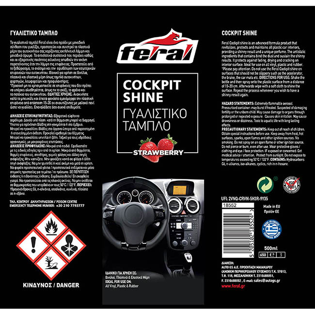Το γυαλιστικό ταμπλό Feral, είναι ένα προϊόν με μοναδική σύνθεση που γυαλίζει, προστατεύει και συντηρεί τα πλαστικά μέρη του αυτοκινήτου σας χαρίζοντας εκπληκτική λάμψη, και μοναδικό άρωμα. Τα αντιστατικά συστατικά που περιέχει καθώς και οι εξαιρετικής ποιότητος σιλικόνες απωθούν την σκόνη παρατείνοντας έτσι την λάμψη της επιφάνειας.