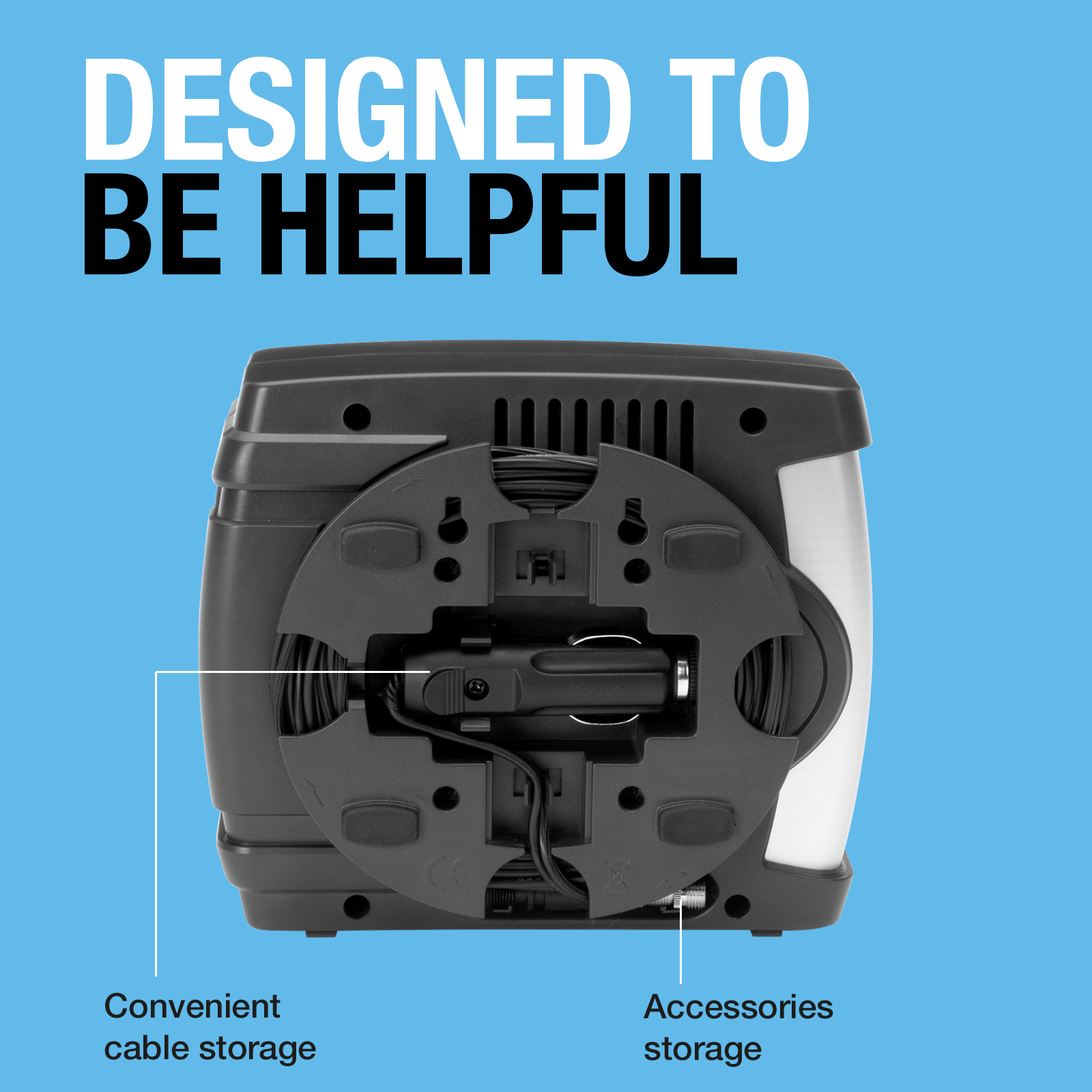 Αναλογικό Κομπρεσέρ ελαστικών RAC610 με κιτ προσαρμογέα τριών τεμαχίων. Διαθέτει ένα ενσωματωμένο βύσμα τροφοδοσίας 12 V και περίπου Καλώδιο 2,9 μέτρων που εκτείνεται σε όλο το μήκος ενός τυπικού αυτοκινήτου, επιτρέποντας την εύκολη πρόσβαση και τον έλεγχο των πίσω ελαστικών. Φουσκώνει ένα ελαστικό στα 35 PSI σε λιγότερο από 4 με 5 λεπτά – εξοικονομώντας χρόνο. Το μανόμετρο εμφανίζει την πίεση σε PSI, kg/cm2 ή BAR για αξιόπιστη και ακριβή απόδοση.