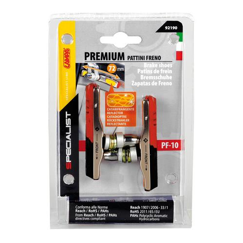 ΤΑΚΑΚΙΑ ΦΡΕΝΩΝ ΠΟΔΗΛΑΤΟΥ ΜΕ ΑΝΑΚΛΑΣΤΗΡΕΣ (CITY/MTB BIKE) PREMIUM 72mm PF-10 ΜΑΥΡΟ/ΚΟΚΚΙΝΟ 2ΤΕΜ. Τακάκια φρένων ποδηλάτου ιταλικής προέλευσης της εταιρίας Lampa. Κατάλληλο προιόν για φρένα τύπου Cantilever ή V Brakes και ιδανικά για όλους τους τύπους ρόδας ποδηλάτου. Διαθέτει ανακλαστήρες στο επάνω μέρος τους για να διακρίνεται ο ποδηλάτης από διερχόμενο όχημα ή άλλο ποδήλατο. Η σειρά Premium Specialist της Lampa έχει ανθεκτική γόμα για απόδοση μεγάλης διάρκειας και εξάλειψη θορύβου και την δυνατότητα σωστής εφαρμογής στο ελαστικό κατά την διάρκεια κίνησης σε βρεγμένο ή στεγνό οδόστρωμα. Τα συγκεκριμένα τακάκια φρένων (παπουτσάκια) ποδηλάτου χρησιμοποιούνται σε ποδήλατα πόλης (city) και βουνού (mountain- MTB). - Διάσταση: 72mm. - Χρώμα: Μαύρο/κόκκινο Συσκευασία 2 τεμαχίων.