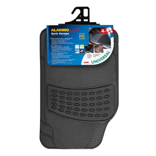 Πατάκια ALADINO Γκρι PVC / μοκέτα μέγεθος 45x70 + 43x45 σύμφωνο με τα ευρωπαϊκά πρότυπα.Δε μυρίζει, δεν ξεθωριάζει, πλένονται, εξαιρετική αντοχή στη φθορά και το σκίσιμο. Μοναδικός σχεδιασμός που κρατά βρωμιά και την υγρασία μακριά. Οικουμενικά, ταιριάζουν τα περισσότερα οχήματα.