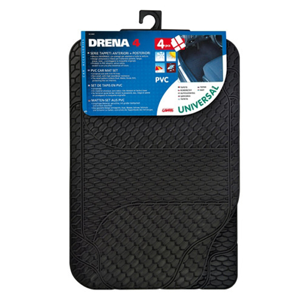 ΠΑΤΑΚΙΑ ΛΑΣΤΙΧΟ DRENA-4 ΜΑΥΡΟ ΧΡΩΜΑ-4 ΣΕΤ Πατάκια DRENA-4, ιταλικής προέλευσης από την εταιρία Lampa. Ειδικά κατασκευασμένα από PVC για προστασία του δαπέδου της εσωτερικής καμπίνας του οχήματός σας. Ανθεκτικά στο υγρό στοιχείο (λάσπη, νερό, χιόνι κ.α). Είναι άοσμα και μπορούν να κοπούν με ψαλίδι (διαθέτει οδηγούς-αυλάκια) δίνοντάς τους το σχήμα που έχει το δάπεδο του οχήματός σας. Κατάλληλο για τα περισσότερα οχήματα. - Σχέδιο: Κυψέλη. - Διαστάσεις: 46x68 cm (εμπρός)/ 45x34 cm (πίσω). - Χρώμα: Μαύρο. - Υλικό: pvc. - Βάρος: 3 kg. - Διαθέτει οδηγό (αυλάκια) για να κοπούν με ψαλίδι προσαρμόζοντάς τα στο εκάστοτε δάπεδο οχήματος. Συσκευασία 4 τεμαχίων.