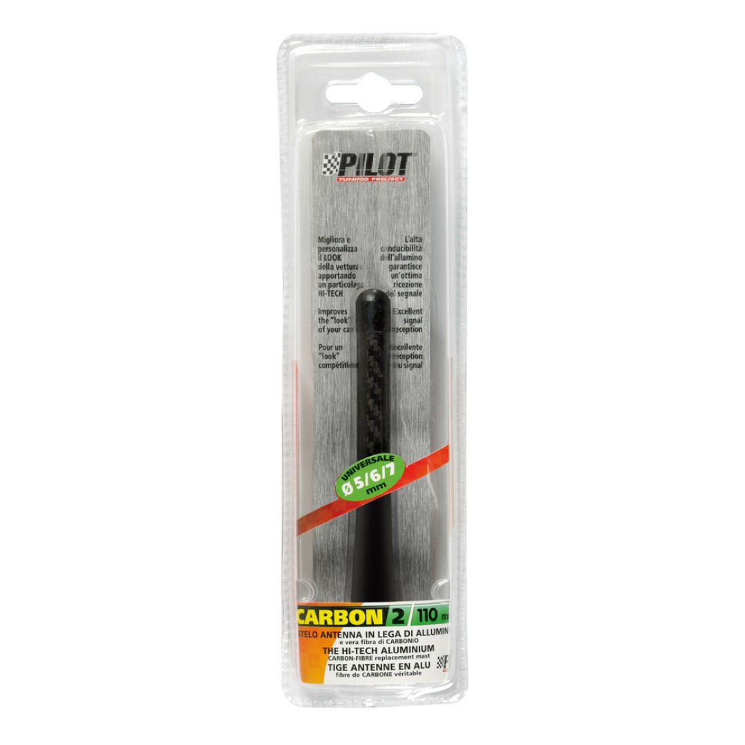 ΚΕΡΑΙΑ ΟΡΟΦΗΣ CARBON-2 110 mm (5/6/7 mm) Κεραία οροφής υψηλής τεχνολογίας CARBON-2 από τη LAMPA, ιταλικής προέλευσης, κατασκευασμένη από αλουμίνιο και ανθρακόνημα σε μαύρο χρώμα με carbon λεπτομέρειες και universal εφαρμογή, κατάλληλη για κεραίες με διάμετρο βάσης 5, 6 και 7 mm (περιλαμβάνονται αντάπτορες στη συσκευασία). Το προϊόν έχει μήκος 110 mm και τοποθετείται στην ήδη υπάρχουσα βάση κεραίας, δίνοντας sport αισθητική στο όχημα σας. Εύκολη και γρήγορη τοποθέτηση. - Μήκος κεραίας: 110 mm. - Διάμετρος βάσης: 5/6/7 mm. - Χρώμα: Μαύρο. - Υλικό: Αλουμίνιο και ανθρακόνημα. - Universal εφαρμογή. - Τοποθετείται στην ήδη υπάρχουσα βάση κεραίας του οχήματος. - Εύκολη και γρήγορη τοποθέτηση. Συσκευασία 1 τεμαχίου.