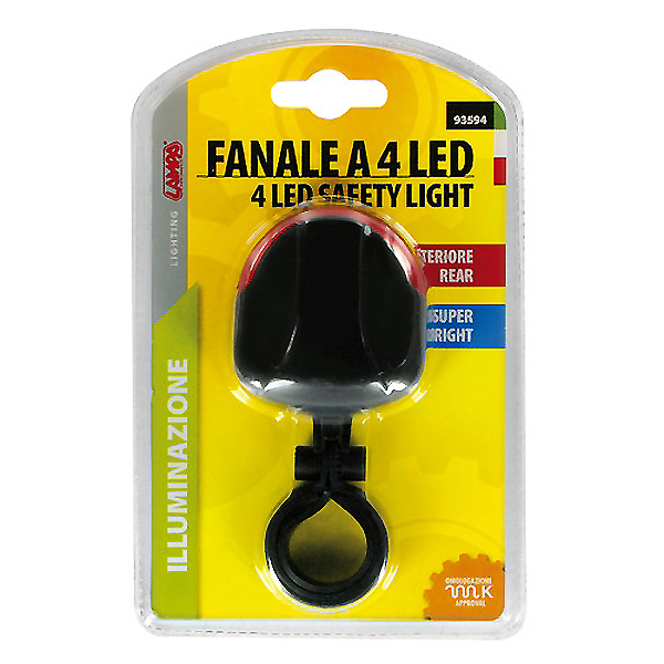 Φανάρι ποδηλάτου (πίσω) ασφαλείας με 4 LED. Με 3 λειτουργίες: Σταθερό, Flash και Στρόμπο. Λειτουργεί με μπαταρίες (δεν συμπεριλαμβάνονται).