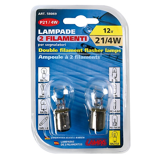 ΛΑΜΠΑ P21/4W BAZ15d ΔΙΠΟΛΙΚΗ ΠΑΡΑΚΕΝΤΡΗ 26,5x52,5mm Κατάλληλη για φώτα φρένων και θέσεως. Σε συσκευασία Blister 2 τεμαχίων.
