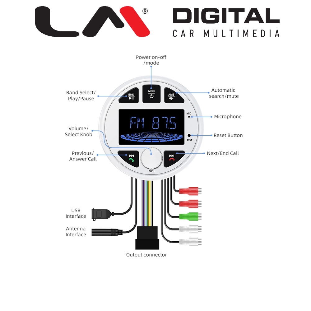 | Επιπλέον χαρακτηριστικά multimedia | 4 x 50 Watt (Easy to Connect Other Marine Speakers and Amplifiers) MP3 Player AM/FM Radio (High Level Radio Chip, Features 18 FM Stations Memory and 12 AM Stations Memory for Your Favorite Real-Time Music, News, Podcast, Etc.) USB stick έως 128GB Είσοδο AUX Ενσωματωμένο μικρόφωνο υψηλής ευαισθησίας Δυνατότητα σύνδεσης με ενισχυτή Θύρα φόρτισης USB: 5V/1A Custom EQ (rock, pop, classic) Απάντηση / λήξη τηλεφωνικών κλήσεων |