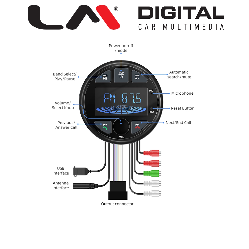 | Επιπλέον χαρακτηριστικά multimedia | 4 x 50 Watt (Easy to Connect Other Marine Speakers and Amplifiers) MP3 Player AM/FM Radio (High Level Radio Chip, Features 18 FM Stations Memory and 12 AM Stations Memory for Your Favorite Real-Time Music, News, Podcast, Etc.) USB stick έως 128GB Είσοδο AUX Ενσωματωμένο μικρόφωνο υψηλής ευαισθησίας Δυνατότητα σύνδεσης με ενισχυτή Θύρα φόρτισης USB: 5V/1A Custom EQ (rock, pop, classic) Απάντηση / λήξη τηλεφωνικών κλήσεων |
